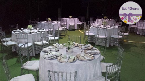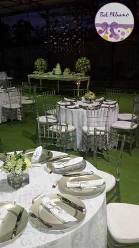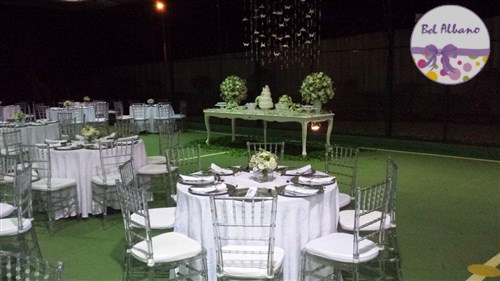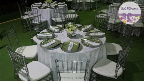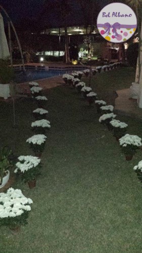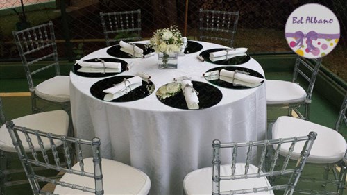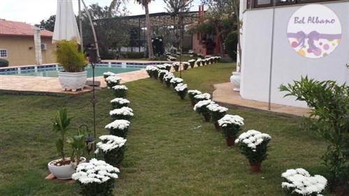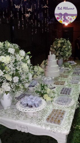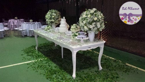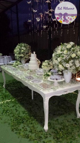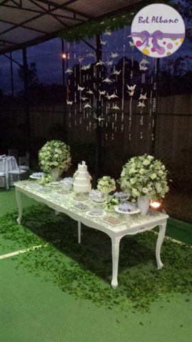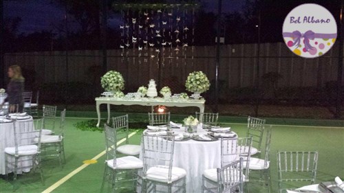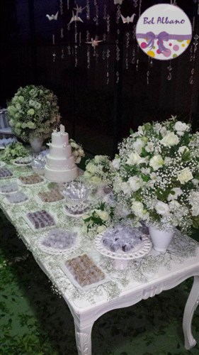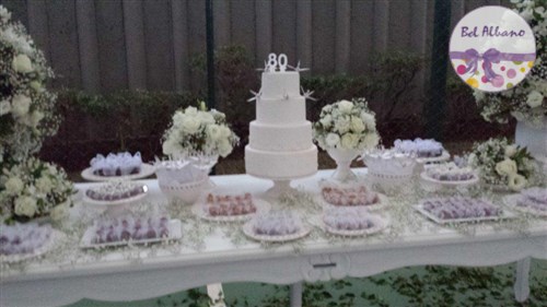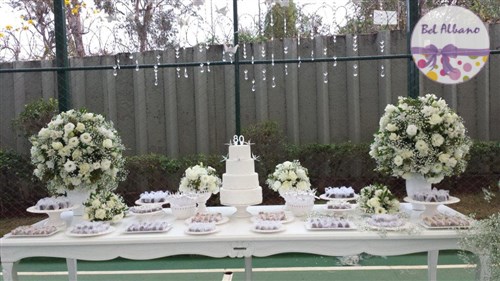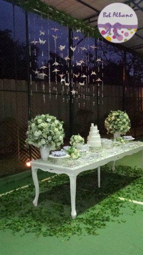 Para comemorar seus 80 anos, Hebe e suas filhas prepararam uma linda festa. A decoração em tons de cinza e branco teve como destaques uma cortina de origami feita pela própria aniversariante e suas filhas. Uma passarela cercada por vasinhos de flor conduziam os convidados até o local da festa.