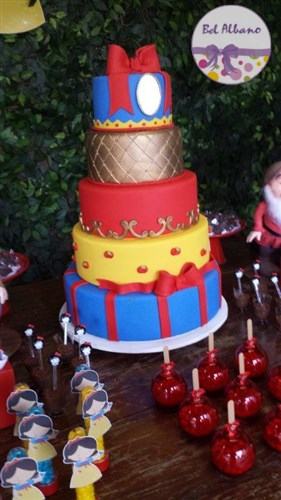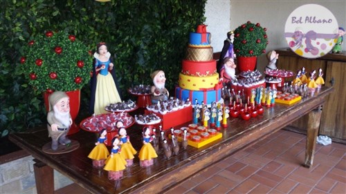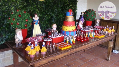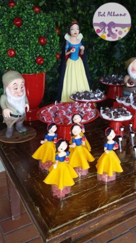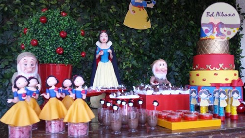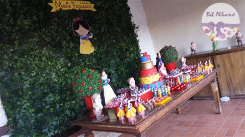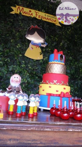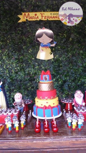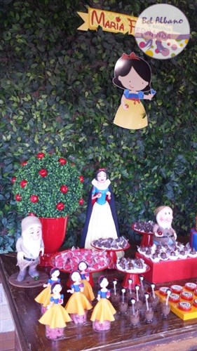 Ficamos encantados com a doçura da pequena Maria. Para seu aniversário de 6 anos, uma linda decoração no tema Branca de Neve.